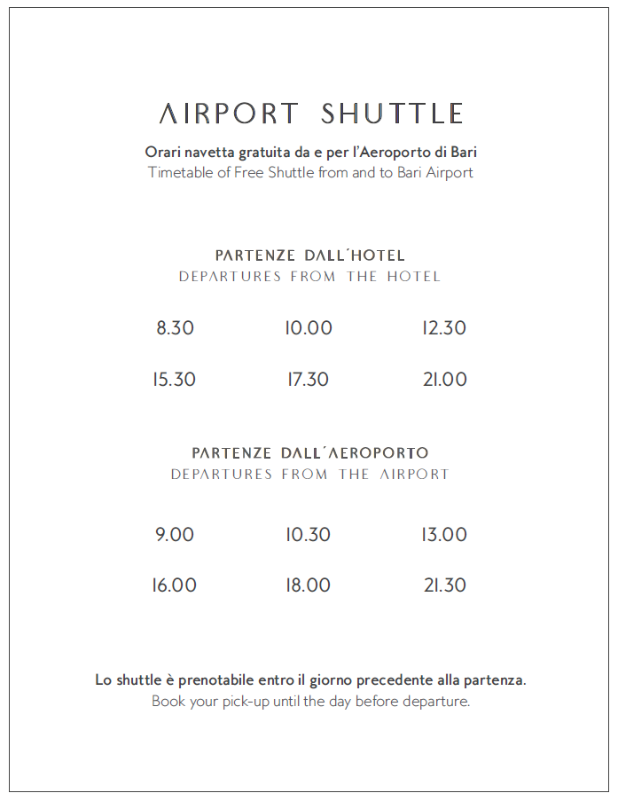 Servizio navetta gratuito da e per l’aeroporto di Bari su prenotazione al 080 5682111entro 24 ore prima, in orari prestabiliti come da tabella